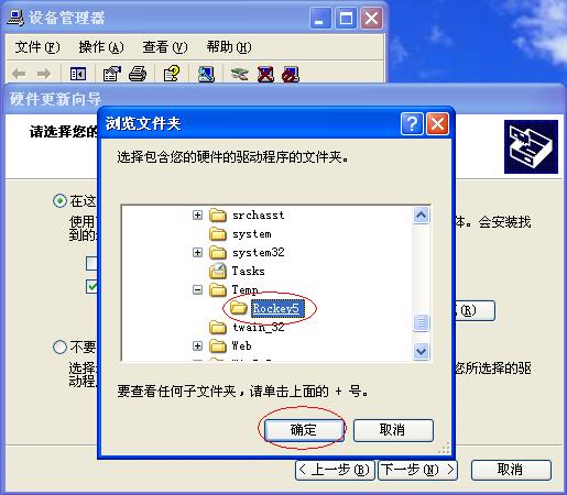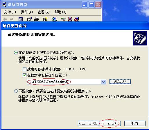 选中“在搜索中包括这个位置”选项框,然后点击右边的“浏览”按钮,从弹出的文件目录框中查找到C/Windows/Temp/Rockey5文件夹,点击“确定”,点击“下一步”