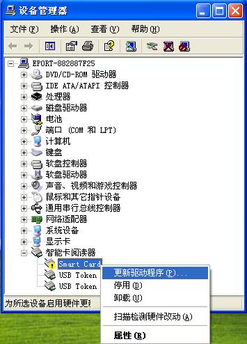 注意如果驱动安装完成后在读卡器设备管理器里面有USB Token Holder但没有USB Token Device显示为带黄色叹号的Smart Card可采取手动安装驱动解决鼠标右键点击Smartcard选择更新驱动程序”。如下图所示。